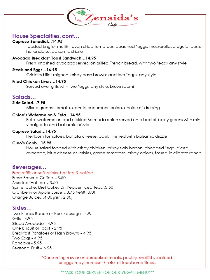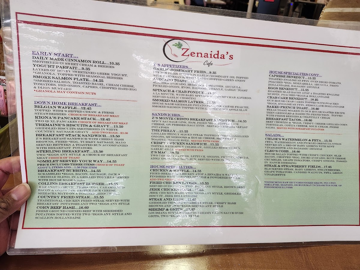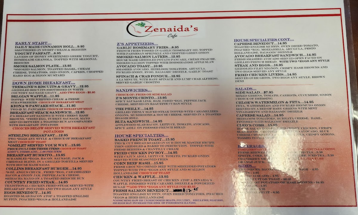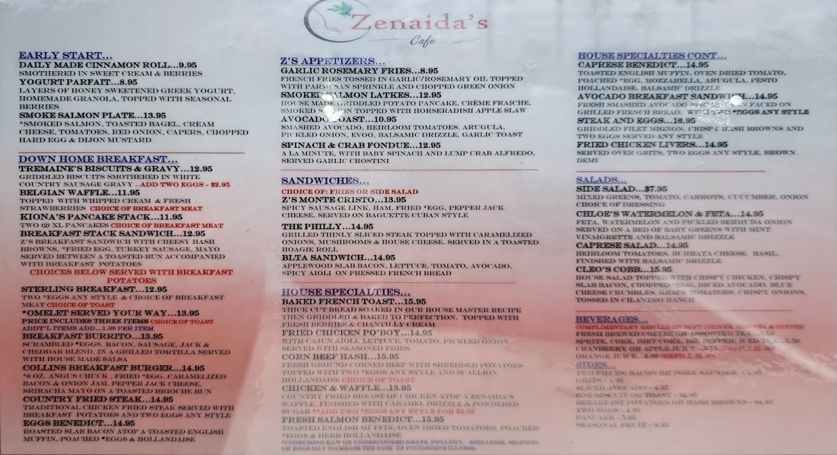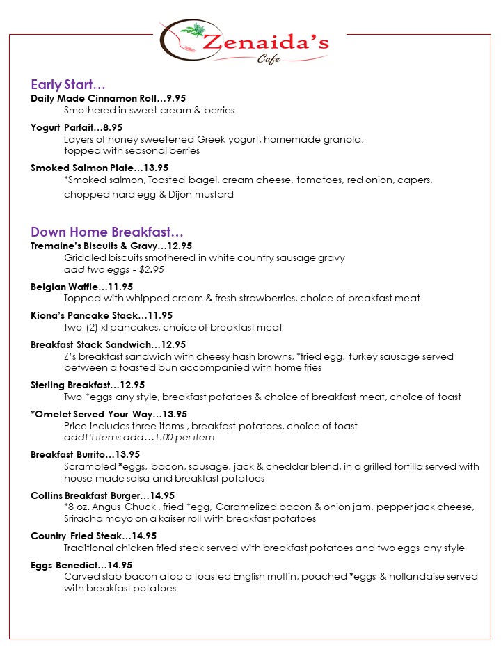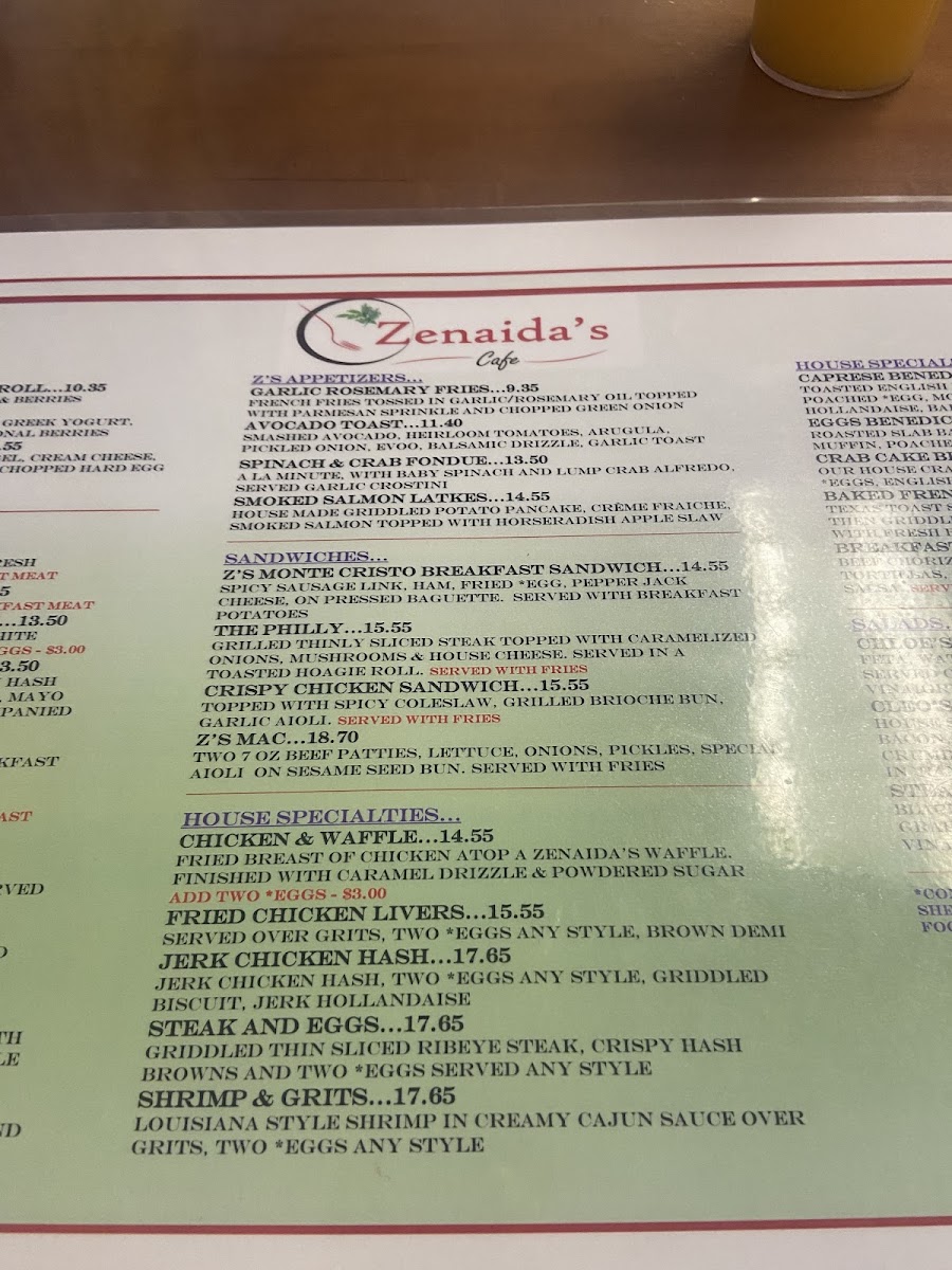 Country fried breast of chicken atop a Zenaida’s waffle. Finished with caramel drizzle & powdered sugar - add two eggs $3