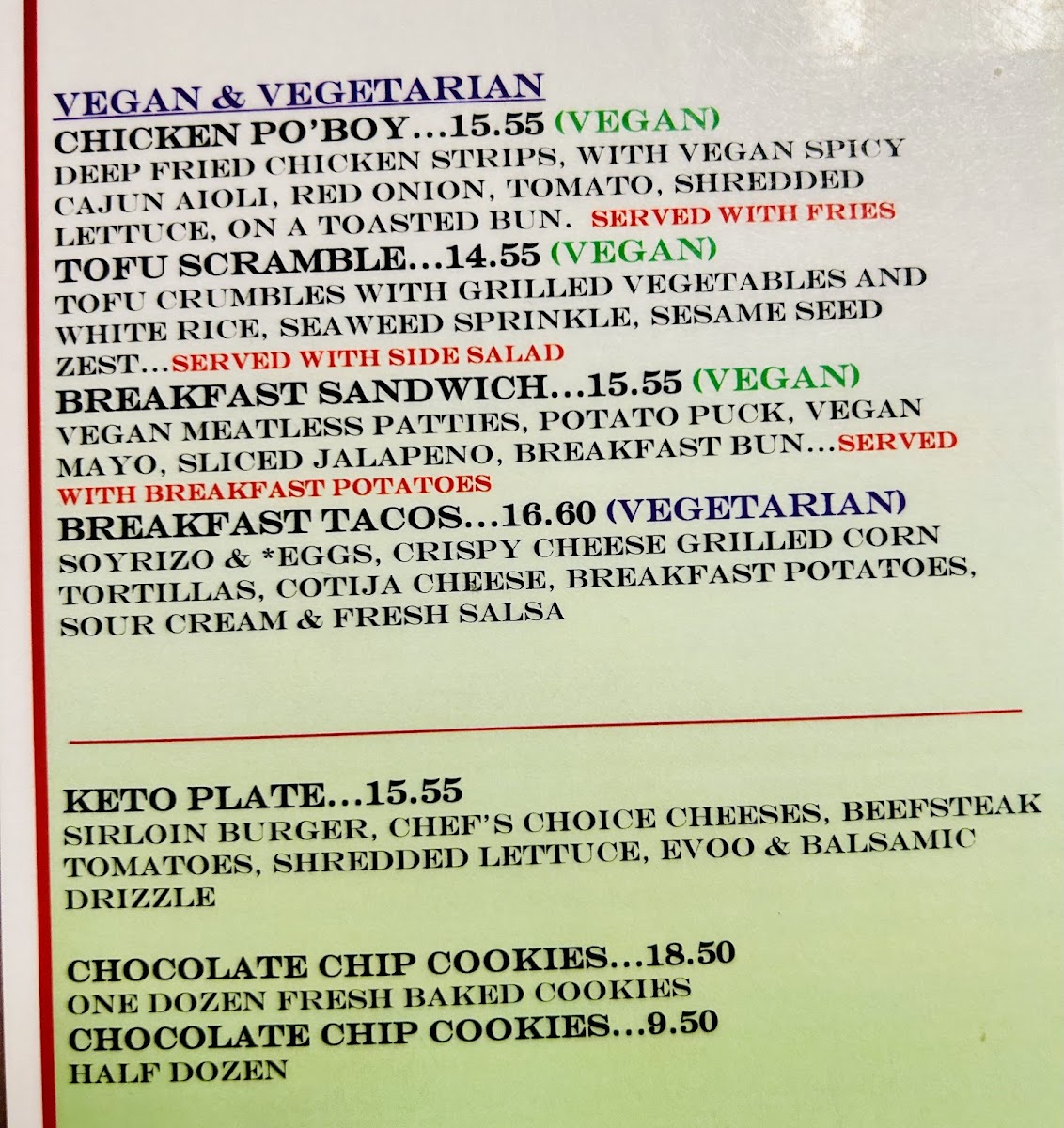 Vegan meatless patties, potato puck, vegan mayo, and sliced jalapeno on a breakfast bun. served with breakfast potatoes